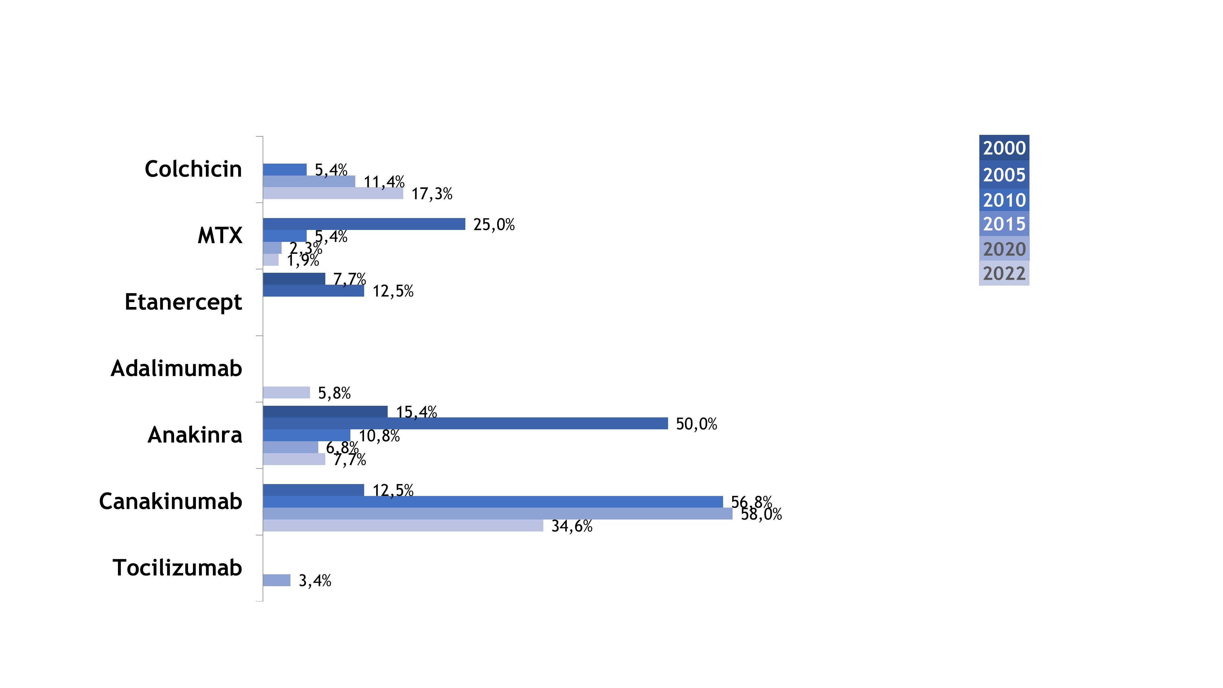 Abb. 12: Veränderungen in der medikamentösen Therapie bei Patient(inn)en mit NLRP3-AID (Daten 2005, 2010, 2015, 2020, 2022) (Vergrößerung durch Klick)
